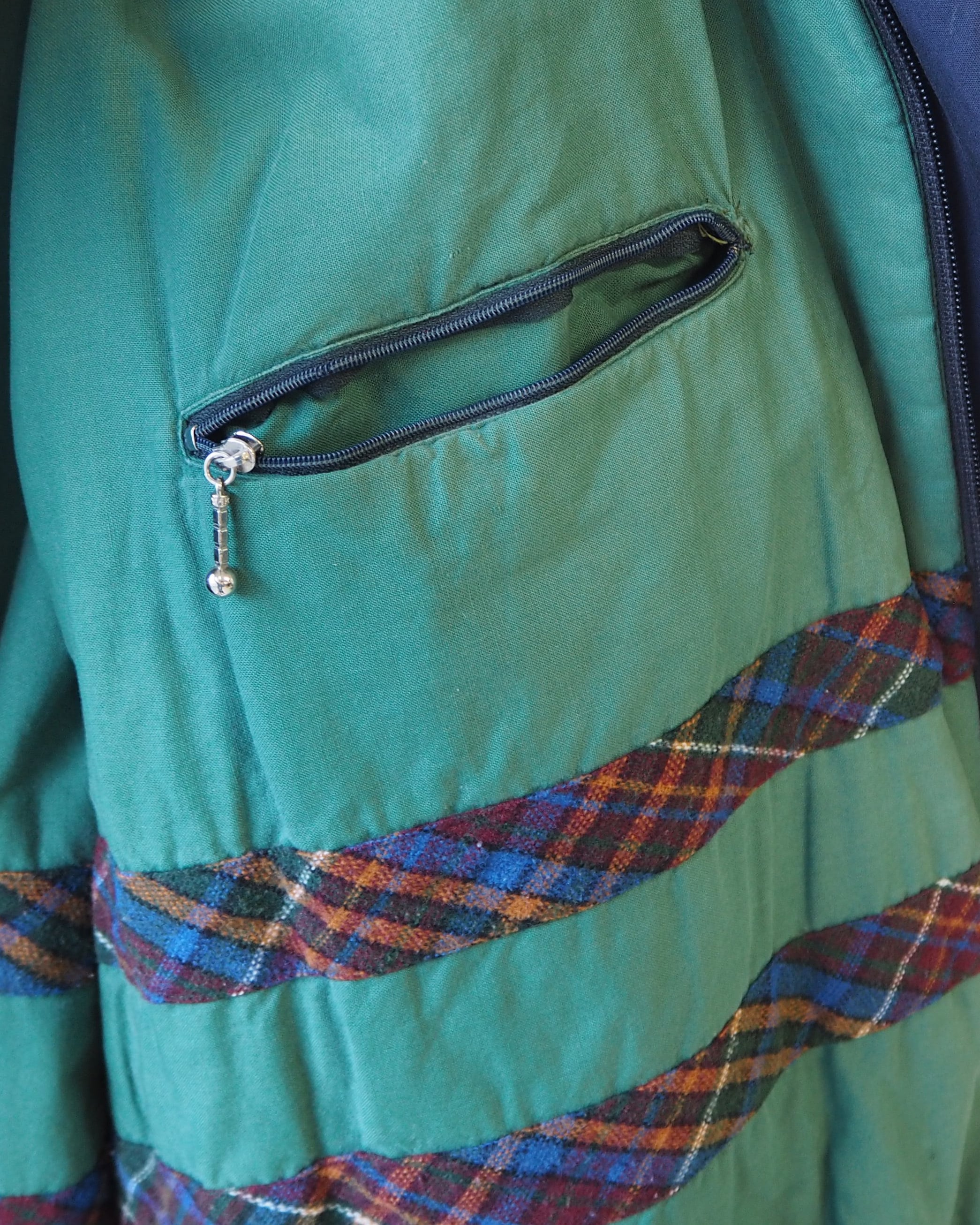 袖裾に汚れあり、内ポケットのファスナーが破損しています。